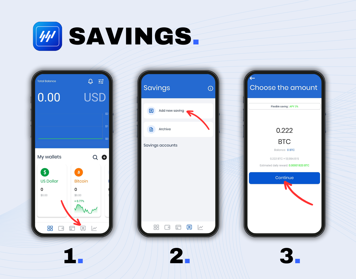 Our savings program is a deposit analog for assets. Users can choose a currency, period, and interest and open a savings account to earn Fiat or Crypto every day. We support Fixed, Flexible and Combo plans.