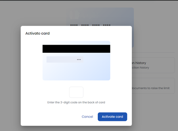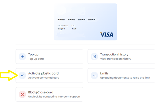 * Go to the cards menu from your dashboard and select the "Activate plastic card" button