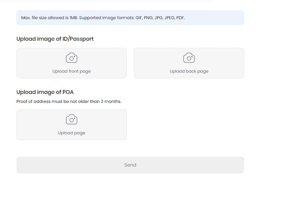 Upload your ID/Passport photos and your Proof of address, and click on the "Send" button